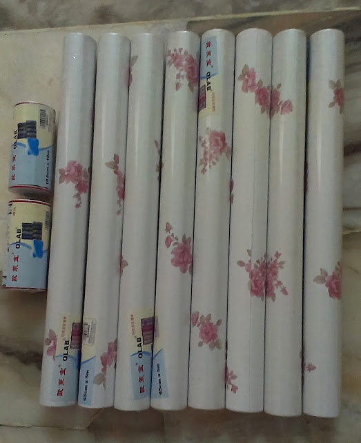 I tagged along to buy the wallpaper in Mr DIY. When we went there this morning, we took some time to choose the design. Initially, my mom was interested in a light colour 65cm x 5m wallpaper, however, it's the only one left, definitely not enough. So, finally we chose the 45cm x 5m wallpaper with rose design because we could find 8 rolls of it, it's bad if half way through, no material to continue and left a half finished job, more is always better than insufficient.