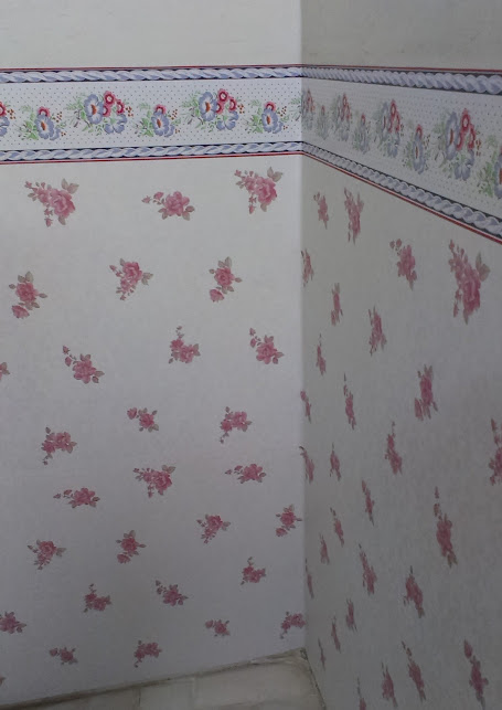 Since 45cm was quite short, we used two, the other one just above the lower wallpaper. To avoid headache, just make sure the second wallpaper is overlapped to the first wallpaper edge. It's easier and no worry there's a gap between the two wallpaper. After finished sticking the rose pattern wallpaper, around 80cm to 90cum of the wall was covered, however, it looked weird. After that, we stuck the shorter sticker above the wallpaper. For this, we had to cut it part by part due to the unevenness of the wall. Although we budgeted by overlapped it with the lower wallpaper, still some gap was left between the wallpaper and the sticker. Luckily, the cutting was not so obvious from afar.