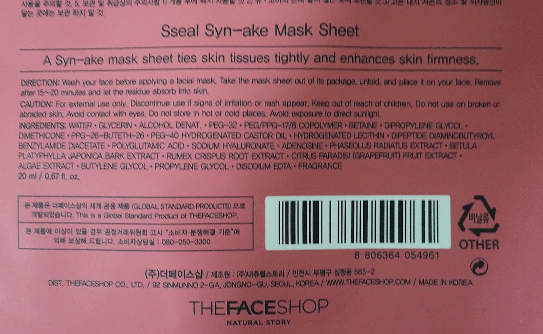 I bought this mask when I went to Busan last January. The salesperson was promoting this mask sheet when me and my friend went to the shopping mall, buy two sets, free one set (one set contains 10 sheets). We tried the other skin care products by The Face Shop, we were awed by a cream, right after applied to the skin, it felt so smooth. So, we decided to buy the Sseal Syn-ake Mask Sheet from The Face Shop. It claims to tie skin tissues tightly and enhances skin firmness. We bought two sets and got one set free. I took one set and my friend took two set and split the cost.