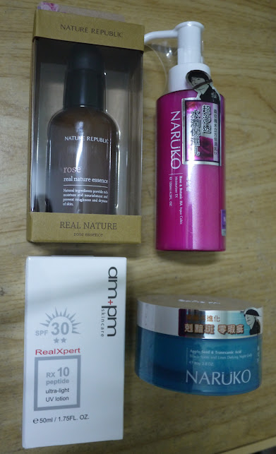 Then, my NRK Rosehip Perfecting Elixir finished in December 2015. I planned to buy a replacement bottle. However, it was sold out. So I looked for other rosehip oil instead. Well, for me, I was willing to try any face oil. There are many types of face oils listed in Gemfive. However, I was choosing base on discount instead of what I really wanted. So, at the end, I bought the Real Nature Rose Essence by Nature Republic instead. It's so bad, not the product, but my greed. Hermo was having a buy 3 free 1 promotion where the cheapest among 4 items was free. So, instead of the original two items that I intended to buy, I ended up with four items.