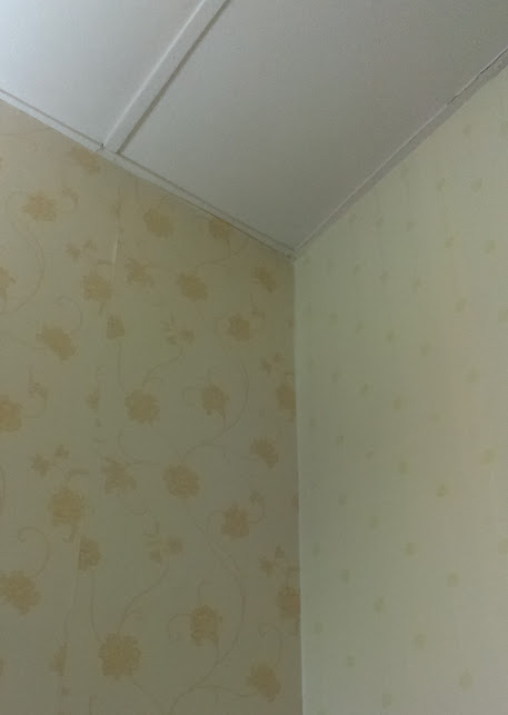 Then, cleaning time. First, I took care of the spider web, then I scrubbed the wall and cleaned the floor. It took almost half a day. I did all the cleaning by myself. However, to stick the wallpaper, I engaged my family members to help me. Although it's a self-adhesive wallpaper, it's very difficult to stick it straight from the top of the ceiling to the floor. After I failed to get it right for a few times myself, I just called my brother to help positioned the wallpaper near the floor while I stood on the ladder and adjusted it on the ceiling edge.